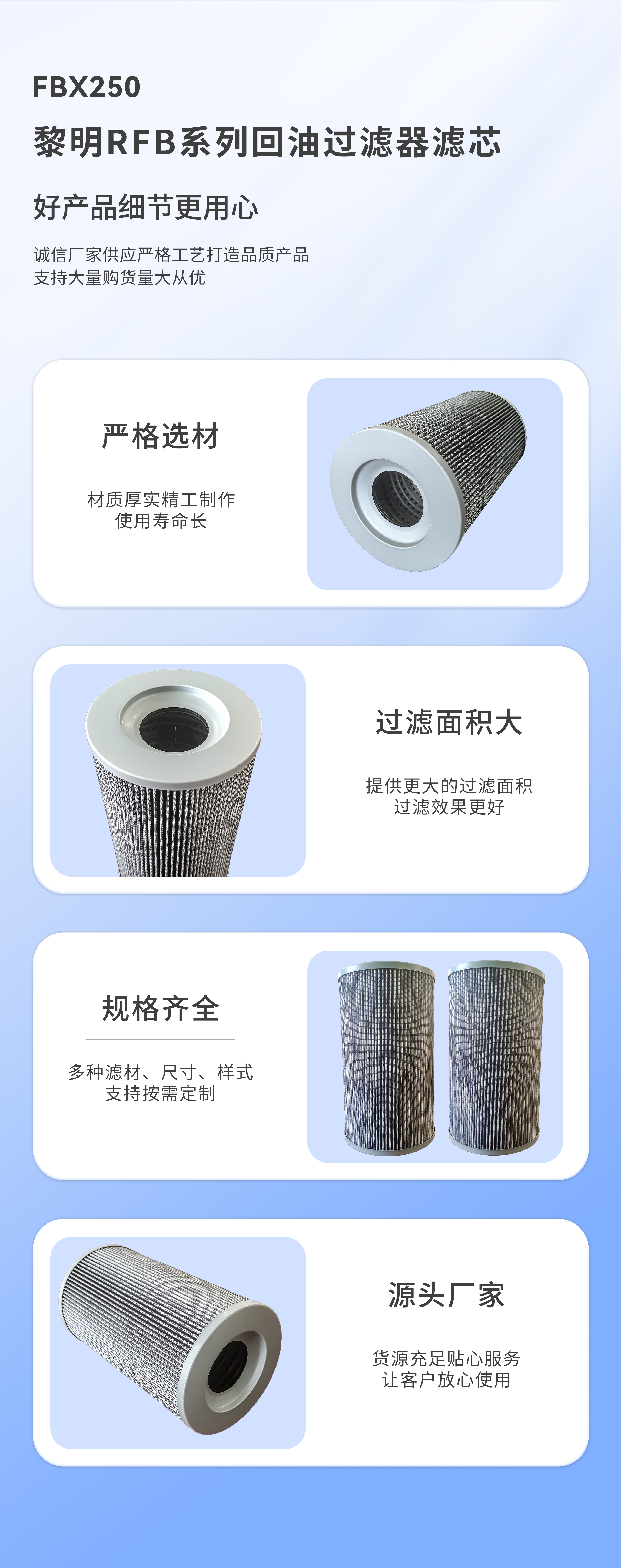 【產(chǎn)品簡(jiǎn)介】:濾芯的濾材一般都要做成波紋狀由3-5層折疊而成,采用濾材成型設(shè)備,這樣才能使多層復(fù)合纖維緊緊靠在支承網(wǎng)上,如果支承網(wǎng)與纖維濾材沒有靠死,就說明它制作工藝欠佳。黎明FBX250回油過濾器濾芯 流量:250L/min 精度:1、3、5、10、20、30微米可選。